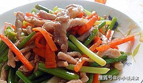 4、鍋內加少許油,放入蔥薑,倒入醃好的蒜苔,炒香後放入炸好的肉絲翻炒片刻,炒勻出鍋。醃蒜苔時加鹽,而不是烘烤時加鹽。