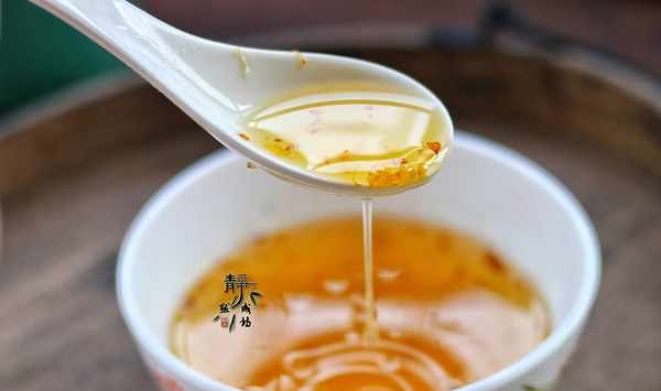 4、把半湯匙淀粉溶於水攪拌均勻,水淀粉即成。把水淀粉倒進小奶鍋中,同時加入食材中的蜂蜜和幹桂花,煮開後即可關火。往山藥上淋的味汁就做好瞭,非常簡單。