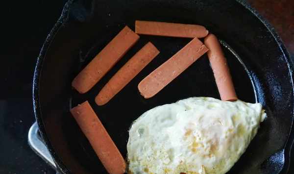 3、雞蛋翻面煎時再放入火腿腸煎香