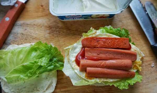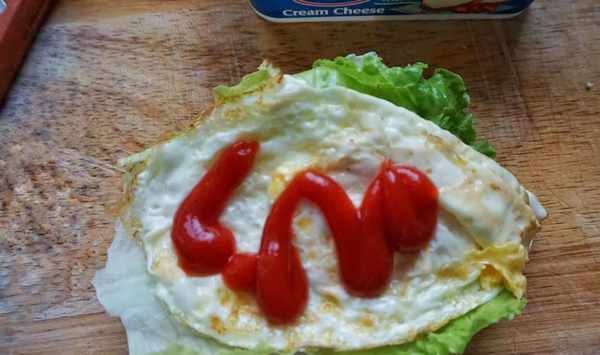 5、在麵包片上放入洗淨的生菜,煎好的雞蛋,然後擠入番茄沙司
