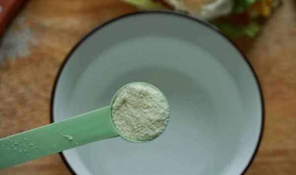12、碗裏盛1碗開水,勺入奶粉,撒入穀麥纖維即可