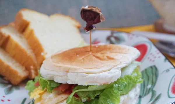 6、再放入火腿腸,在另一片麵包片上放入生菜,將兩片麵包片蓋上即成火腿雞蛋漢堡