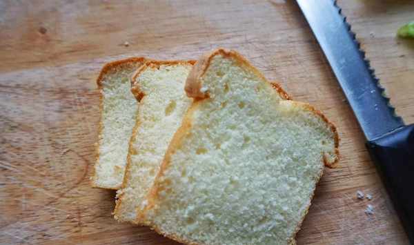 7、將蛋糕用麵包刀切成約1釐米的厚片