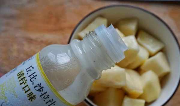 10、蘋果去皮切塊,放入碗裏,加入沙拉醬攪拌均勻