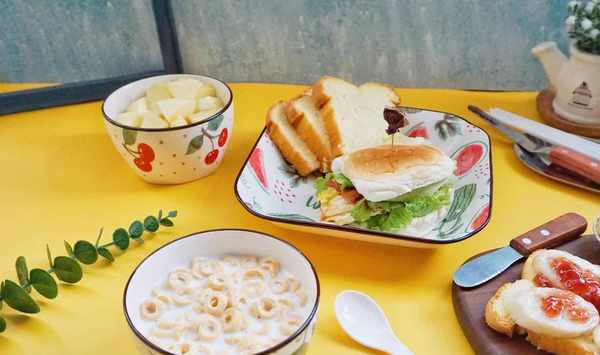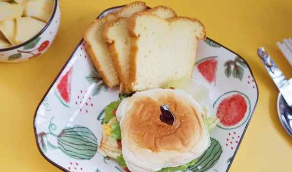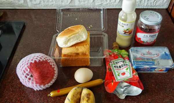 【漢堡蛋糕三明治早餐】牛奶麵包3個,蛋糕半個,雞蛋3個,火腿腸3根,生菜1顆,香蕉2根,蘋果1個,沙律汁適量,塗抹起司適量,番茄沙司適量,蛋撻2個,植物油適量