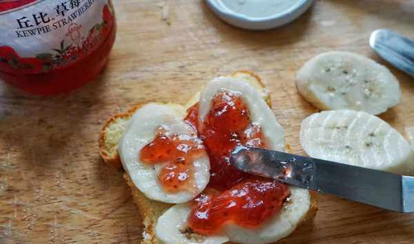 8、在蛋糕上放入香蕉片,塗抹上草莓果醬