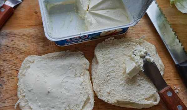 4、取一牛奶麵包,用麵包刀將麵包橫面切成兩半,在麵包上均勻用塗抹刀塗上塗抹起司