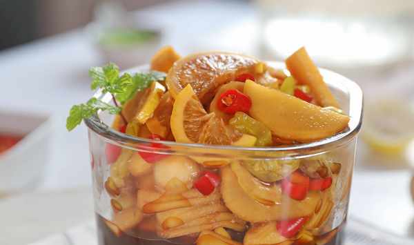 第五步:拌勻後放幾片香橙,密封存放一晚上入味,第二天杭式醬蘿卜擺盤就可以開吃啦。