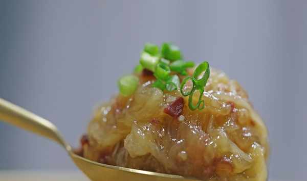 第九步:時間到瞭開蓋,放松蔥花點綴,蒸好的蘿卜丸子就可以開吃瞭。