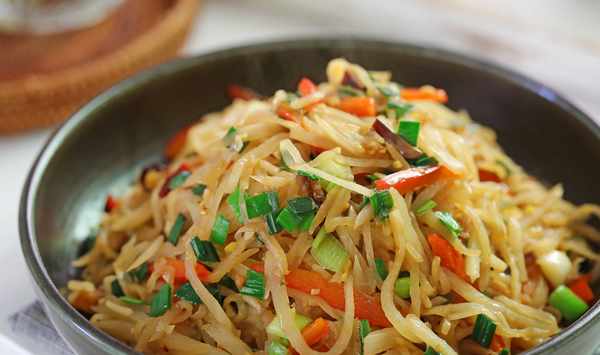 第四步:出鍋前撒上紅椒絲和青蒜苗再次翻炒均勻就可以盛出裝盤開吃啦。