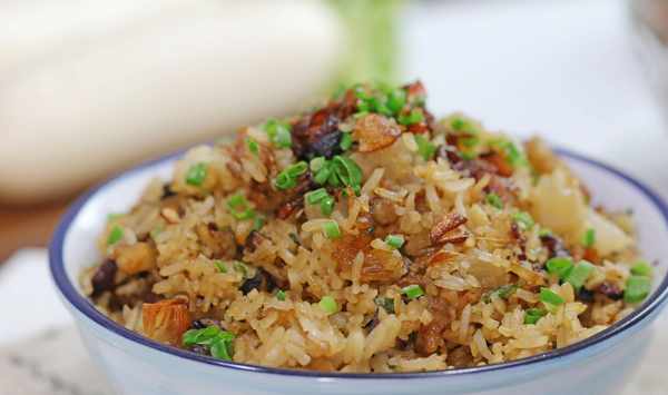 第一步:香菇泡發切小塊,白蘿卜去皮切丁,紅蔥頭切碎,蘿卜幹切碎末備用。