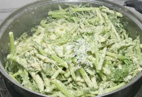 2.先少撒一點麵粉拌勻,再撒入玉米粉,直到茼蒿裹上一層厚厚的麵粉即可。用雙手輕輕攪拌,不要太用力擠壓。