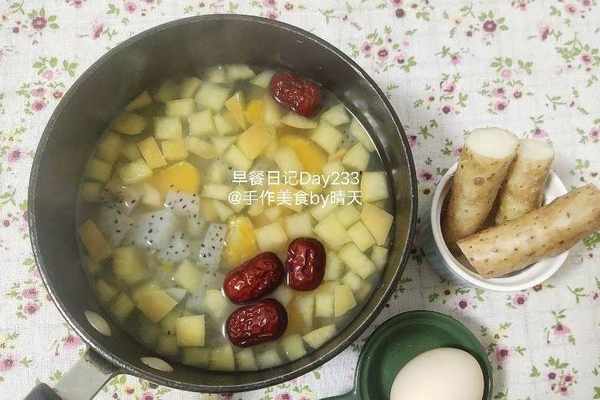 冰糖橙半個,火龍果1/4個,蘋果半個,紅棗6顆,以上4樣一起煮茶,蒸山藥和雜糧粘豆包