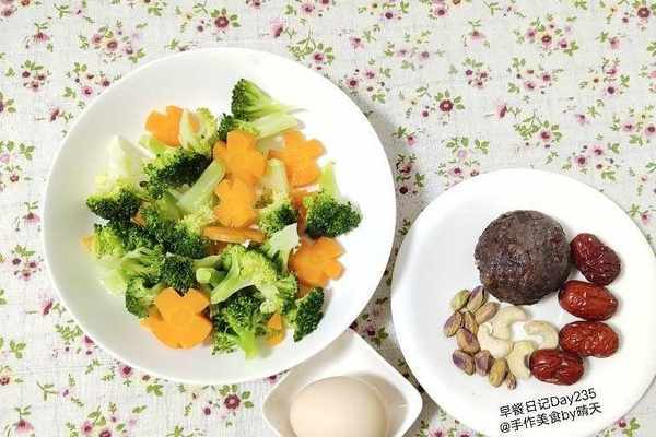 【Day4】10分鐘做早餐,蔬菜,雜糧豆包,1把堅果,和4顆紅棗。
