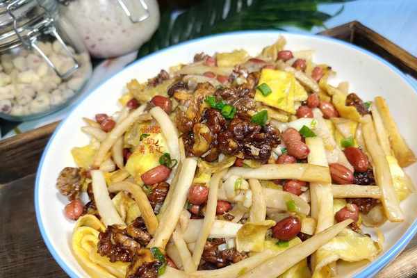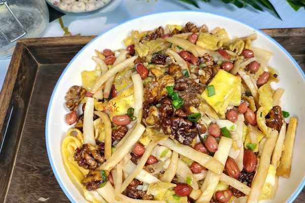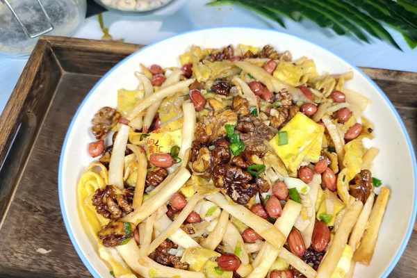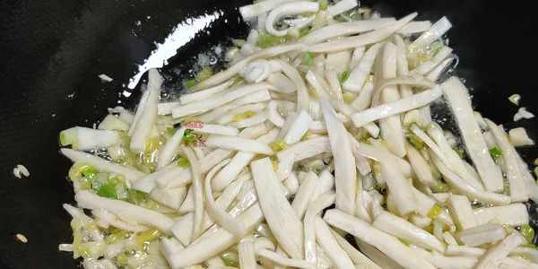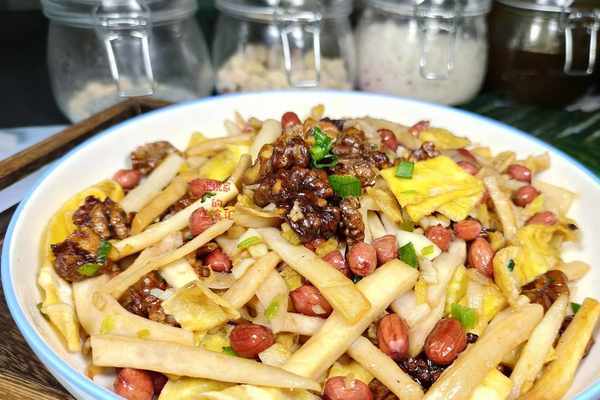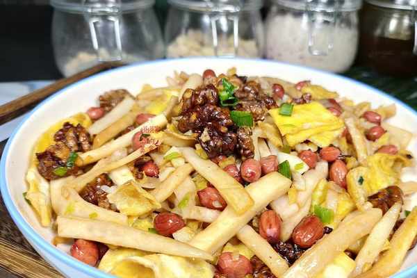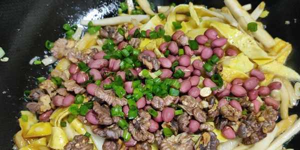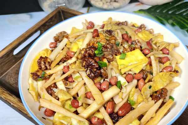 【第三步】:起鍋燒油,油隻要放一點點就夠瞭,放入蔥薑炒出香味,再把控幹水分的杏鮑菇倒入鍋中拌勻,然後放入雞蛋絲,核桃和花生,放食鹽,生抽調味,