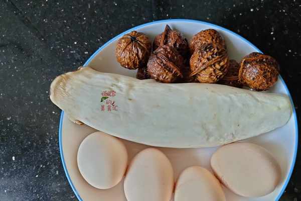 準備材料:杏鮑菇200克,雞蛋4個,核桃300克