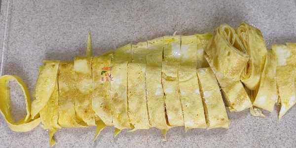 然後再切成長條,這樣子煎出來的雞蛋皮口感勁道,鮮香好吃還不油膩,