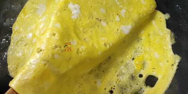 先倒入1/2的蛋液鋪平來,開中小火給它煎成金黃色的雞蛋皮,煎好之後取出來卷起來,