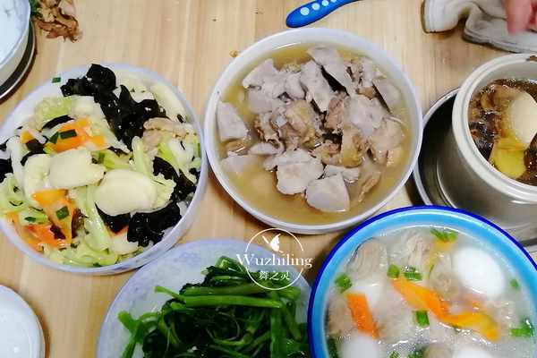 看看今天我們祖孫三代的晚餐吧:分別是太平燕、花菜炒白果,芋頭燉鴨、茶樹菇燉軟排,最後是一道炒空心菜。