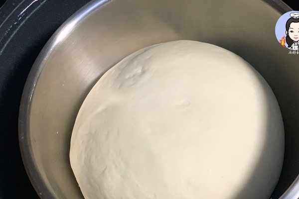 4、揉好的麵團蓋上保鮮膜,放在溫暖的地方發酵至原來的兩倍大。(敲敲小黑板:這裡教大家一個實用的方法,鍋中加入1小碗水,開火煮一分鐘即關火,之後把面盆放在鍋中,蓋上蓋子發酵,麵團在人為製造的濕潤又溫暖的環境中很容易發酵,節約發酵時間,也就30分鐘左右就可以發滿盆。)