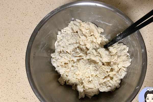 2、一邊加入調製好的混合酵母水,一邊攪拌麵粉成無乾粉的面絮狀。