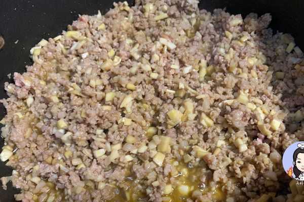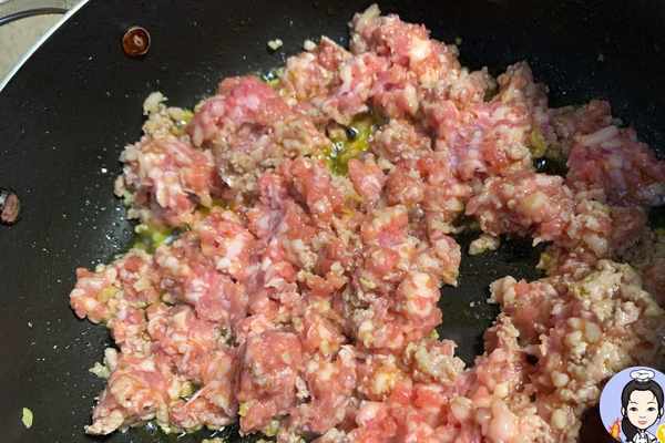 6、炒鍋中加入適量的植物油燒熱,先放入蒜末爆香,之後放入豬肉餡翻炒至變色。