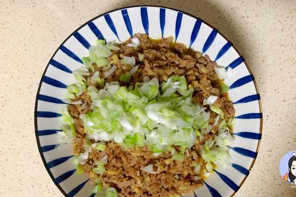 8、餡料中加入蔥花翻拌均勻調味後放入冰柜冷藏備用。。