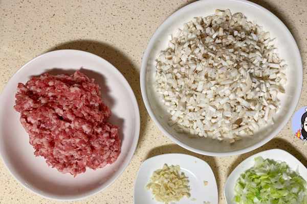 餡料:猪肉600克、杏鮑菇(香菇)2個、大葱1根、大蒜3瓣、蚝油1湯、生抽2湯匙、鹽少許、植物油適量