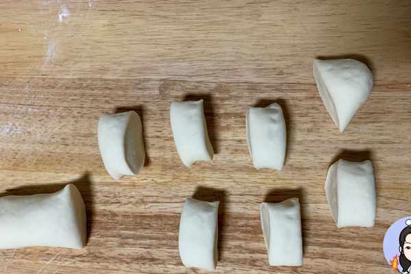 9、案板上撒上適量幹麵粉,取出醒發好的麵團放在案板上重新揉光滑,排出麵團裡面的氣體,搓成長條狀,分切成大小相對均勻的面劑子。