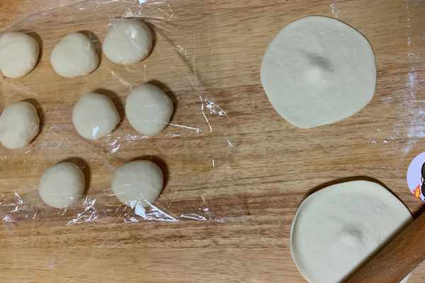 10、把每一個面劑子在手心中揉圓按扁,取一面劑子用擀麵杖擀成邊沿偏薄,中間偏厚的圓形包子面皮。(備用的面積子注意要蓋上保鮮膜,防止水分蒸發變幹)