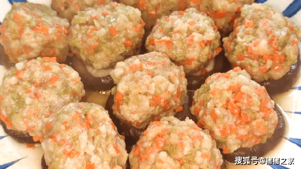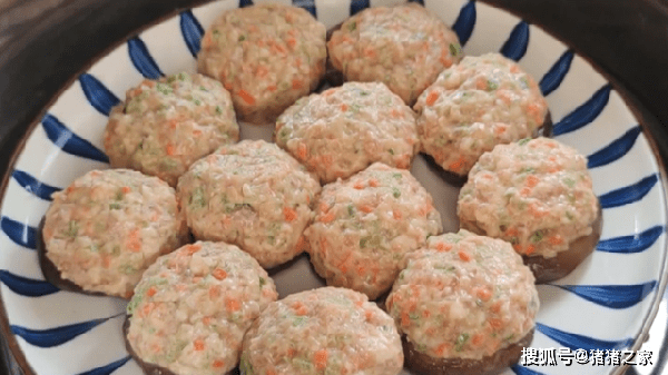 5.手上帶上手套後抹少許的清水,把肉餡捏成一個個的丸子,捏好的丸子擺放在香菇上面,全部都做好後放入蒸鍋裡面,上汽後轉小火蒸20分鐘。