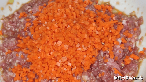 3.準備一根胡蘿卜,削去外皮後先切成片,然後再切成絲,最後切成小碎丁,把切好的胡蘿卜丁放入肉餡裡面,再把醃制好的苦瓜,用手擠幹水分,也放進肉餡中,再加入2大勺淀粉,攪拌均勻,再加入少許香油增香提味,再次攪勻後先放一旁備用。