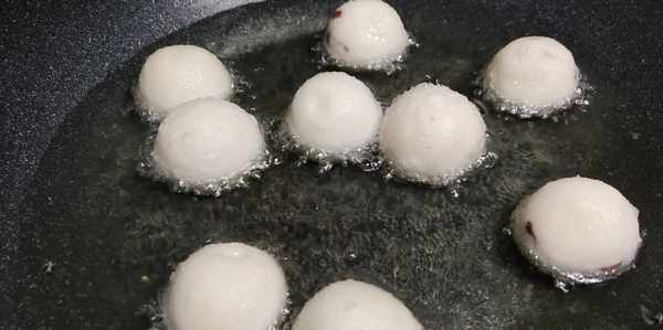 8:鍋裡倒入適量的油,油溫燒至六成熱,把糯米紫薯丸子放入油鍋