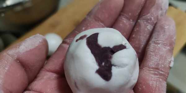 7:把糯米丸子放手心裡,用力壓成餃子皮的樣子,然後把紫薯丸子放進去,包成湯圓的樣子,包緊一點就好瞭