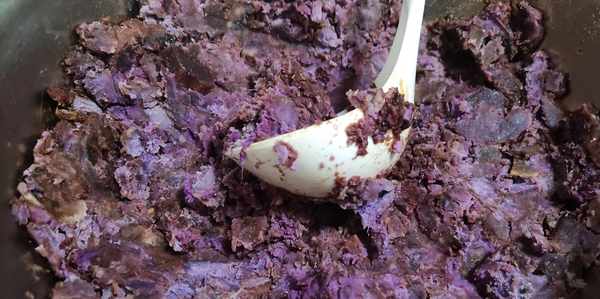 3:把蒸熟的紫薯倒入盆裡,用碾碎揉成光滑的面團備用