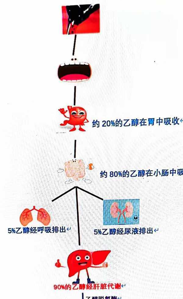 飲入的乙醇80%由小腸上段吸收,其餘由胃吸收。空腹飲酒時,在1小時內有60%被吸收,2小時吸收量達95%。乙醇被吸收後,通過血流遍及全身,約90%在肝臟由乙醛脫氫酶和過氧化氫酶氧化為乙醛,由乙醛脫氫酶進一步氧化為乙酸,最後經三羧酸循環氧化為水和二氧化碳。約10%乙醇不經氧化而緩慢經肺、腎排出。
