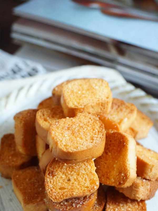 5.我們將它兩面都刷上蜂蜜黃油,這樣更入味。如果你不願意翻面,就刷一面,那……也行,自己做的美食自己說瞭算。最後在表面撒一層砂粒糖,悄悄的告訴你,我撒的是外面喝咖啡用不瞭的小糖包,這樣一份面包幹,一小袋10g左右就夠瞭。