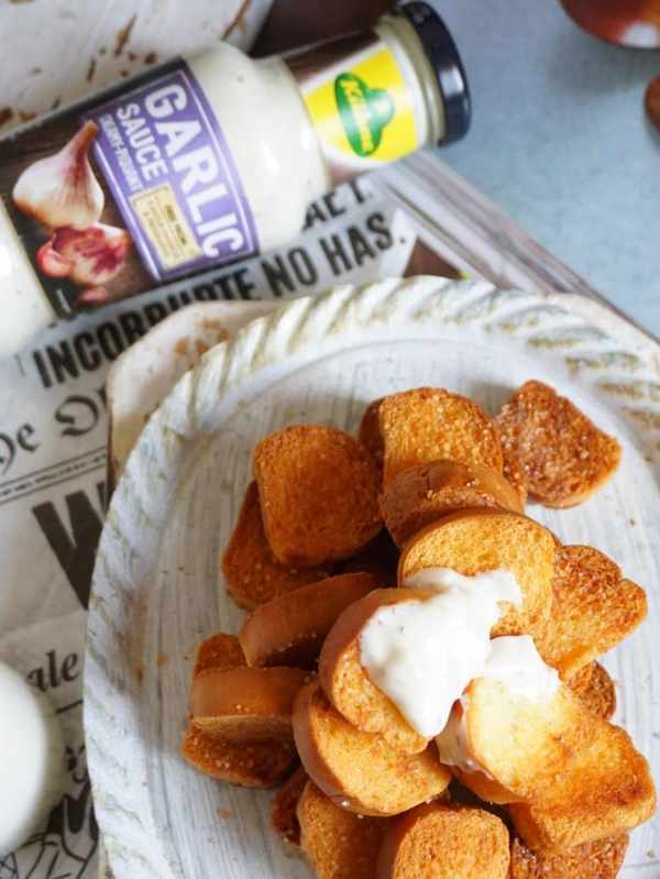 8.好吃的同時,作為吃貨的我又發現瞭新吃法,那就是配著大蒜沙拉醬來吃,更是絕配!大傢可以試試看,還有什麼更美味的搭配~今晚就拿出你傢的剩面包,做一份吧,明天的早餐又解決啦。