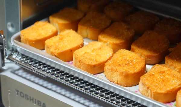 6.烤箱不用預熱,直接開150度,8分鐘就完成啦!如果面包塊大,那就10分鐘,如果小丁,那就6分鐘。這個看它顏色決定,金黃酥脆的樣子,就OK。我最近真是大愛這個小烤箱,做個早餐什麼的,簡直太方便瞭。