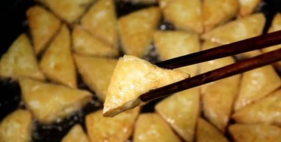 2、起鍋倒入食用油,開小火把剛剛切好的豆腐放入鍋裡煎,煎熟之後翻面繼續煎,反復煎兩面,熟後出鍋備用。