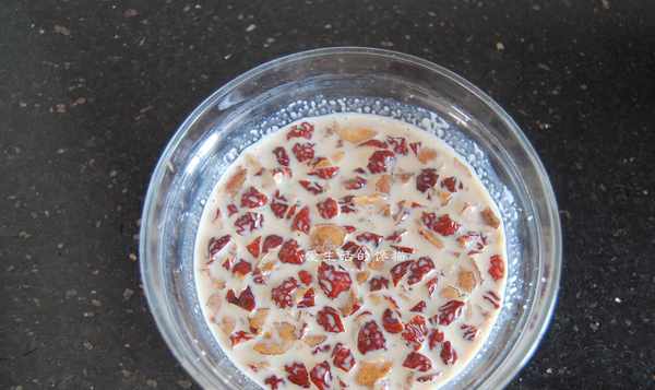 2,用剪刀把紅棗的肉剪下來,盡量剪小一點,然後把紅棗浸入牛奶裡面,這一步會讓紅棗變得更柔軟,再把紅糖和酵母放進去攪拌融化,液體材料就準備好瞭。