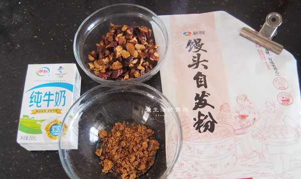 1,準備好食材,紅糖紅棗和牛奶是絕配,做出來的饅頭超級香,一定要記得用牛奶代替清水哦,天冷發酵會比較久,所以要把牛奶熱一熱再用,溫度不要太高以免把酵母燙死瞭。