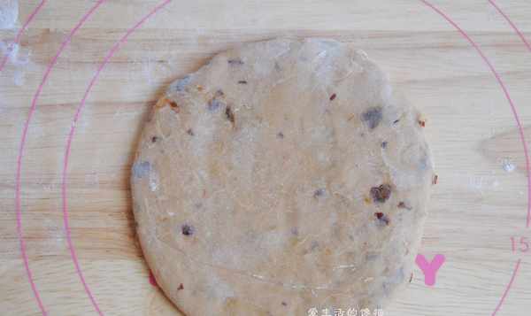 6,用搟面杖把小面團搟成直徑大概是12cm的圓形,上下1/3折下來,壓緊。