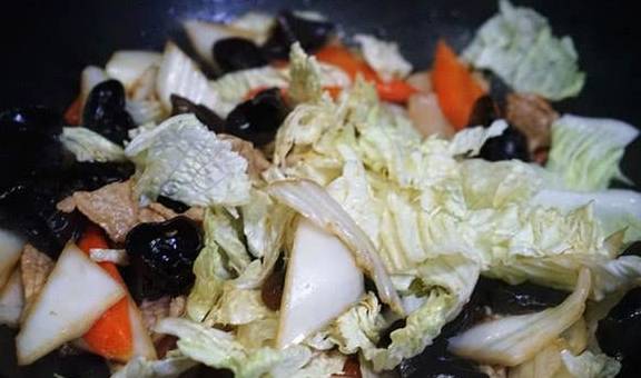 最後倒入白菜葉,炒勻後一分鐘左右就差不多瞭。