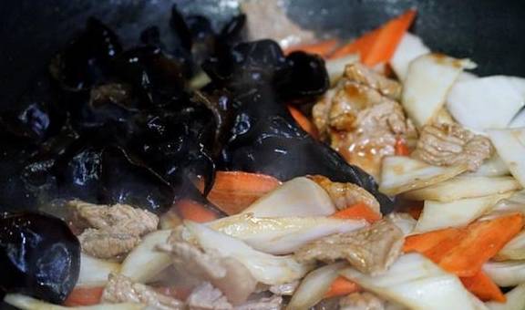 4、接著倒入木耳,來一勺生抽。生抽是為瞭調味,剛才加入蠔油是提鮮又提亮,加入這兩種調味汁後翻炒均勻,嘗嘗味道可以酌情加入少許糖,咸味是基本夠瞭。