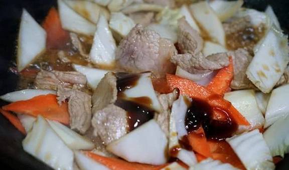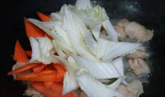 3、鍋內放入食用油,燒熱後先下肉片,快速翻炒至變色,再倒入胡蘿卜片和白菜幫,加入一勺料酒、一大勺蠔油翻炒均勻。