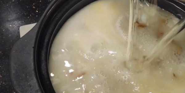 這個時候倒入山藥汁和一大碗清水,上蓋開啟,大火燒開,燒開後轉中小火煮15分鐘。當要經過料理機打出來的泡沫比較多,但要打成汁,濃稠度也比較高,所以泡沫也就比較豐富一點。