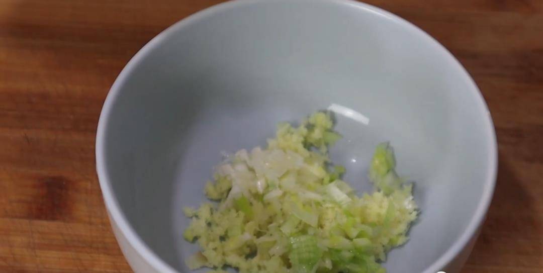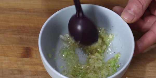 剩下小蔥切碎,然後加入少許的芝麻油。鹽、雞精、鹽H雞粉,少許的白胡椒粉攪拌均勻,然後澆上滾燙的花生油。把它拌勻放在一旁備用。