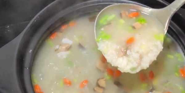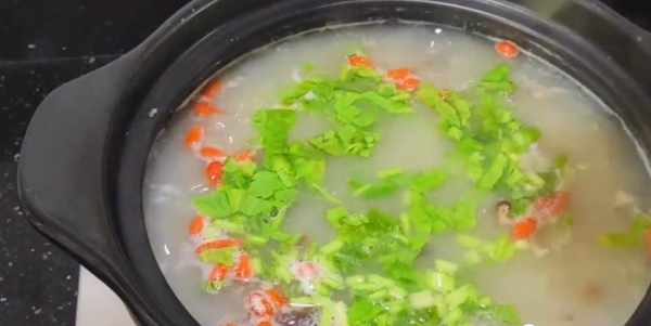 來點小勺的鹽,適量的雞精,撒下芹菜末,然後用鐵勺攪拌一下,化開調料,熱到營養非常豐富的山藥枸杞瘦肉粥就做好瞭。