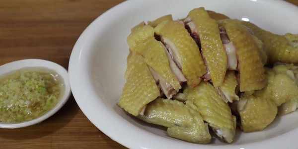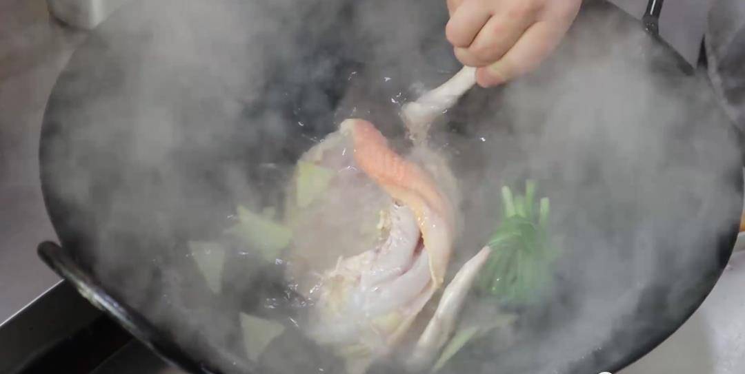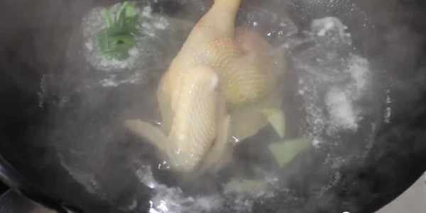 鍋入水燒開,放入薑片。小蔥。適量的米酒,食鹽。然後放入雞燙一燙。大概燙五秒鐘撈起。如此反復三次。